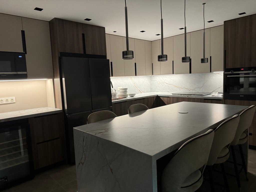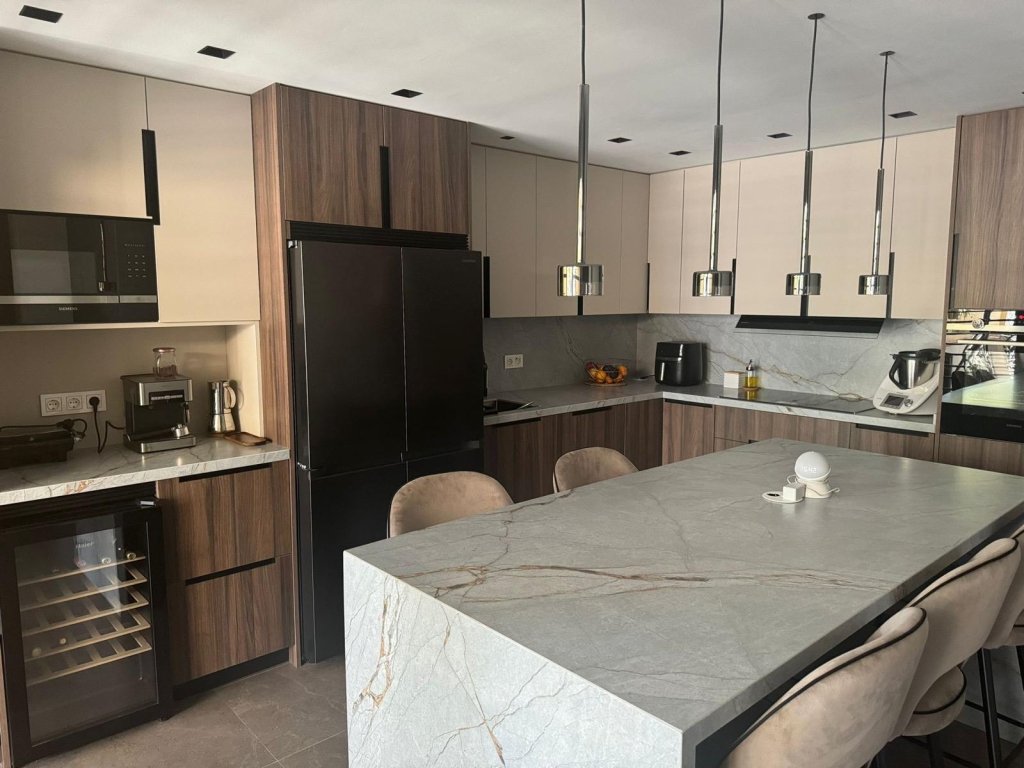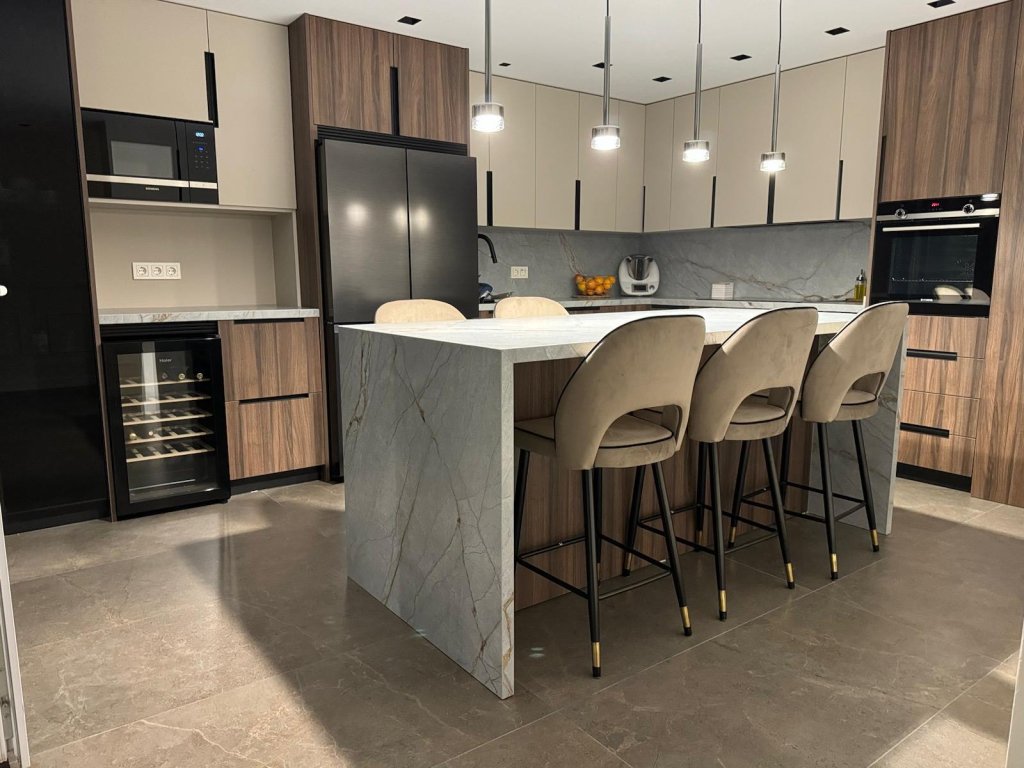 Composición de cocina acabada con puertas altas en color crema y puertas bajas, de columnas y despensas en acabado madera.Encimera porcelánica gris veteada y paquete de electrodomésticos de alta gama componen una espectacular cocina donde poder disfrutar al máximo la experiencia tanto de cocinar como de punto de reunión de familiares y amigos.