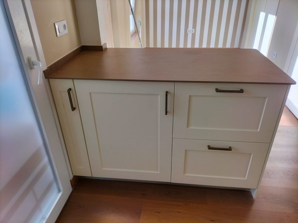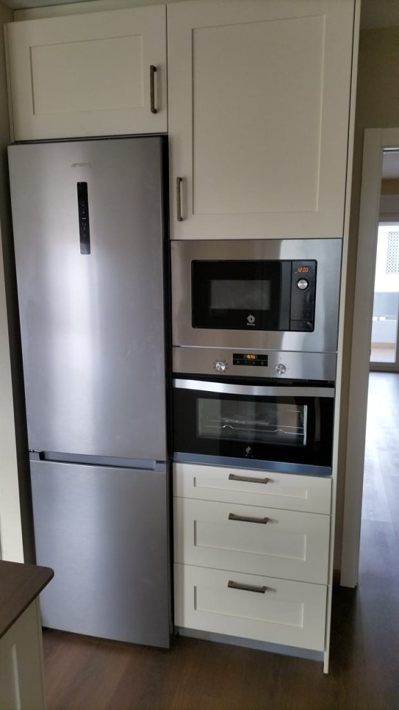 Preciosa cocina con toques vintage compuesta de puertas lacadas en color crema, texturizadas y con tiradores rústicos para dar un toque clásico a la vez que moderno con sus electrodomésticos de última generación, la encimera es de material porcelánico imitación a madera de Nogal para así dar una fuerte contraposición con los tonos pasteles de las puertas y paredes.En definitiva, una cocina llena de contrastes que no deja indiferente a nadie.¡A nosotros personalmente y sobre todo a sus dueños les encanta!
